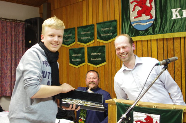 Ein besonderer Moment in der Versammlung war die Übergabe der vergoldeten Klappenflöte. Diese Flöte wurde dem Spielmannszug zum 100. Jährigem Jubiläum geschenkt wurden. Auf dieser Flöte soll ein engagierter Spielmannn (unter 18 Jahren) spielen. Jasper Rode, der Vorbesitzer der Flöte, wurde nun zu alt und ein neuer Spielmann darf sich an diesem Instrument erfreuen. Für sein Engagement und seine Leistungen bekam Jean-Luca Reinecke die Klappenflöte von unserem Übungsleiter Holger Janczak überreicht.