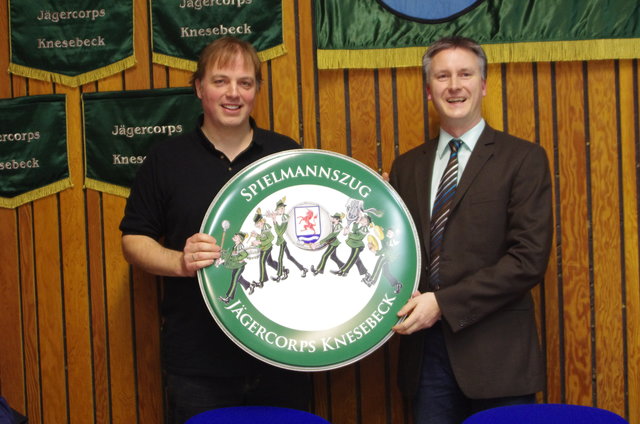 Im Laufe der Versammlung standen Wahlen für Vorstandsposten an. Unser Gerätewart André Kahle schied nach 16 Jahren aktiver Vorstandsarbeit aus und war nicht mehr bereit eine erneute Amtszeit in der Position des Gerätewartes auszukleiden. Für seine langjährige Vorstandsarbeit bedankte sich Hendrik Mann und überreichte Kahle ein Spielmannszug Jägercorps Paukenfell.